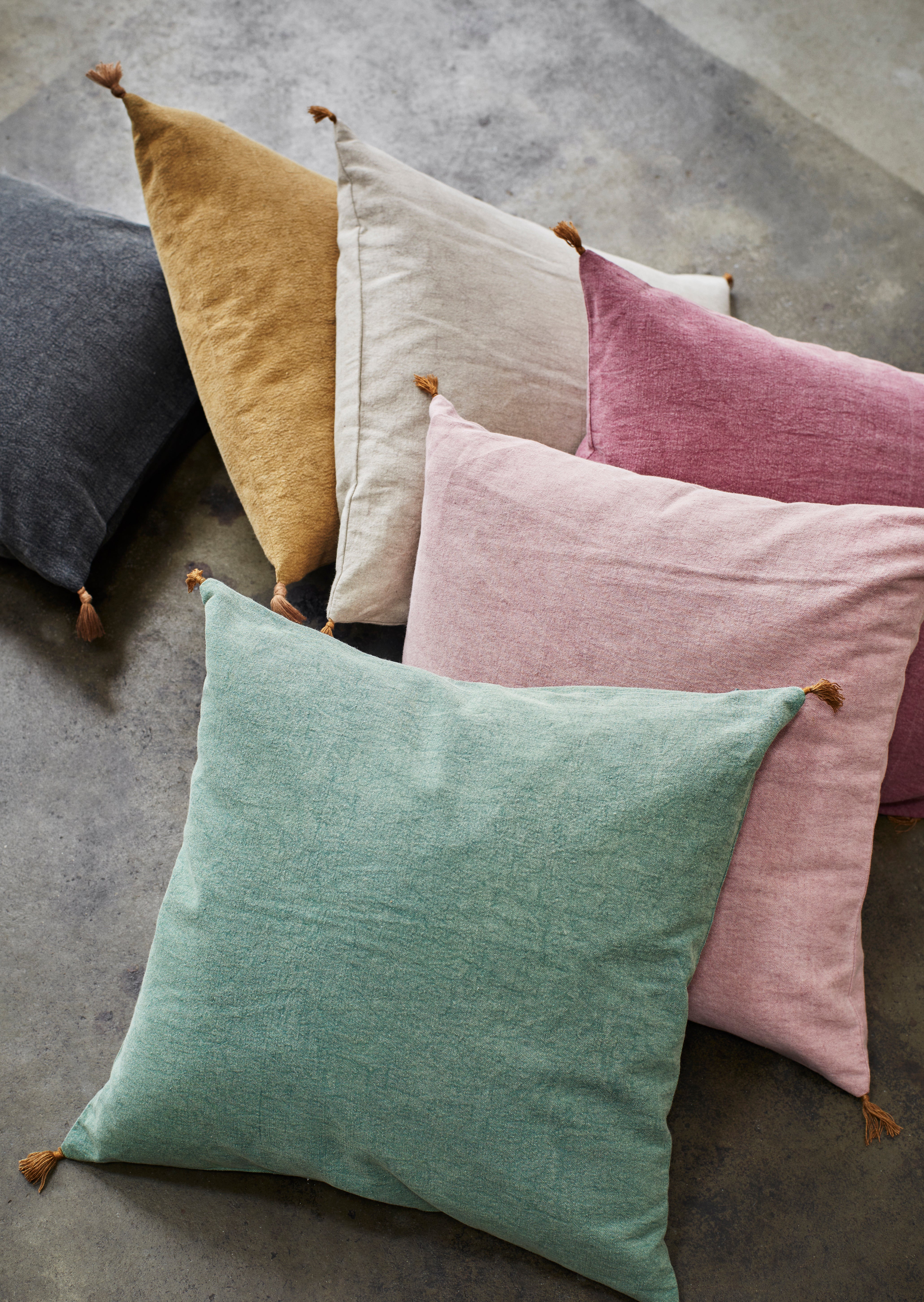 Enzyme washed cotton cushion cover with tassels.