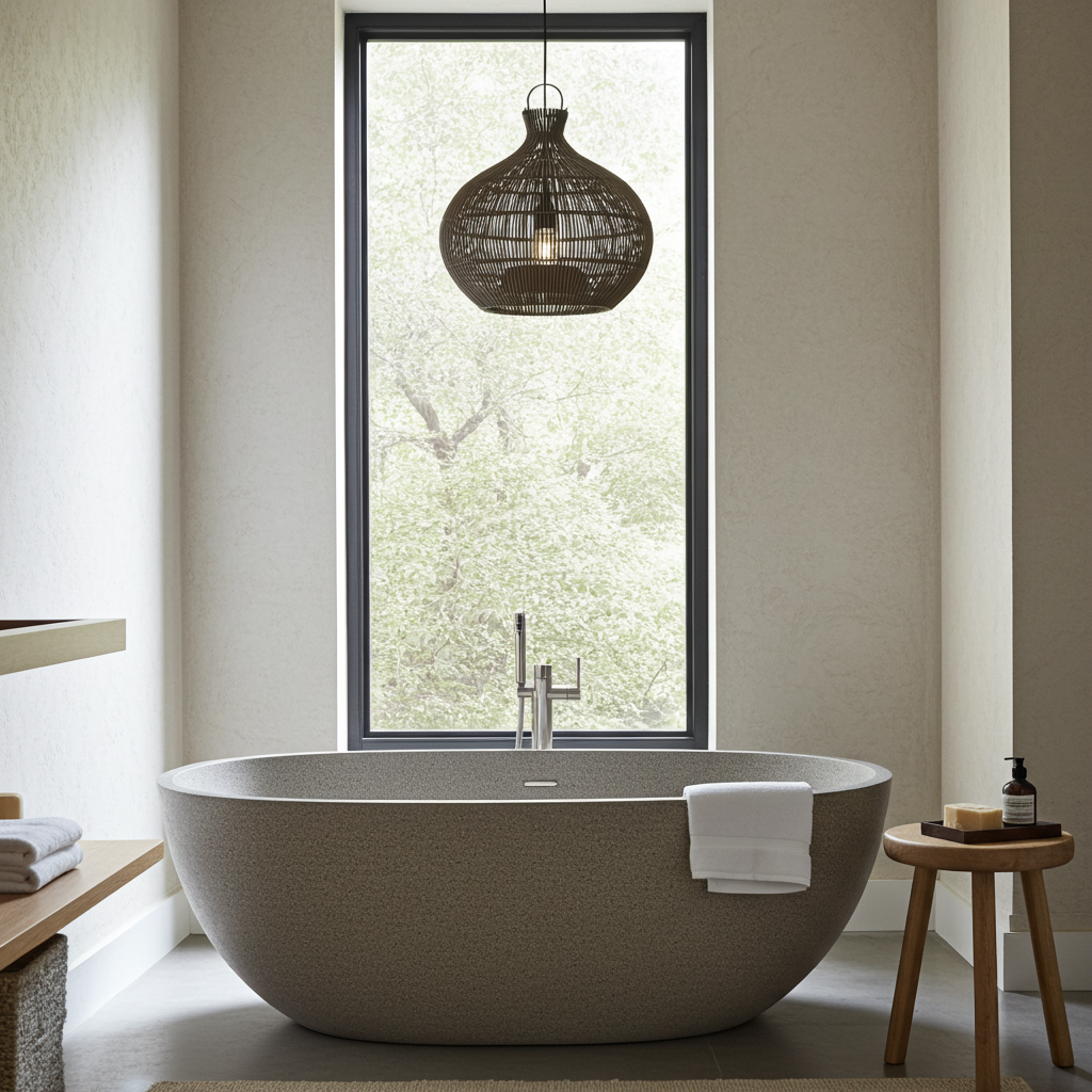 Modern uk bathroom with a freestanding bathtub, window, and rattan pendant light.